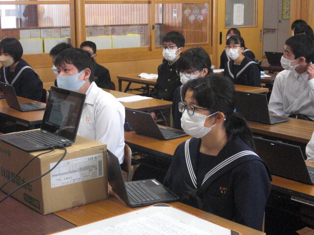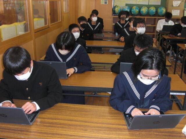 児湯地区の数学の先生方の研究の一環で、町内3中学校のオンライン合同授業(1年生)がありました。事前に各学校でテーマに沿った調査を行い、調査結果を分析して気づいたことなどを発表しました。本校の生徒も上手に発表をしました。発表の後は、他の2校からの感想なども聞きました。授業後の感想として、「他校の発表などを聞いて新鮮な気持ちで授業を受けることができました」といった声もありました。自分の学校にいながらでも他校の生徒と一緒に勉強できるのは便利です。また、お互いに刺激し合うことで、学力向上にも役立つのではないでしょうか。