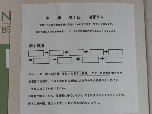 今月下旬(3年生は修学旅行後)の期末テスト に向けて、「リレー宅習」を行うことになりました。「家庭学習の充実」は、生徒総会の協議題にもなっていましたので、生徒会学習委員会の取組としても位置づけます。各学級で5つのグループをつくり、その日の当番の人が自分のグループの宅習ノートを使って宅習をします。翌日は次の人にノートをリレーしていくというものです。宅習のモチベーションアップや宅習方法の参考になることを期待しています。詳しくは、各学級からのお知らせをご確認ください。