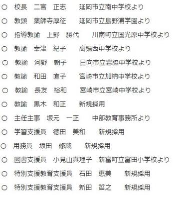 陽春の候 皆さまにおかれましては、ますますご健勝のこととお喜び申し上げます。日頃から、本校の教育活動に多大なるご支援、ご協力を賜りまして誠にありがとうございます。さて、この度の定期異動で、下記の通り14名の職員が本校に着任いたしました。新年度を迎え、より一層本校教育の充実・発展のために職員一丸となって取り組んでいく所存でございます。保護者の皆さまには、これまでと同様、本校教育へのご理解とご支援をいただきますようよろしくお願いします。