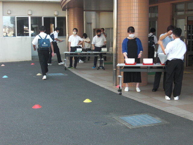 生徒玄関前で健康観察カードを提出し、一人ずつ検温と手指消毒をしてから校舎に入ります。全生徒に確実に対応するために、