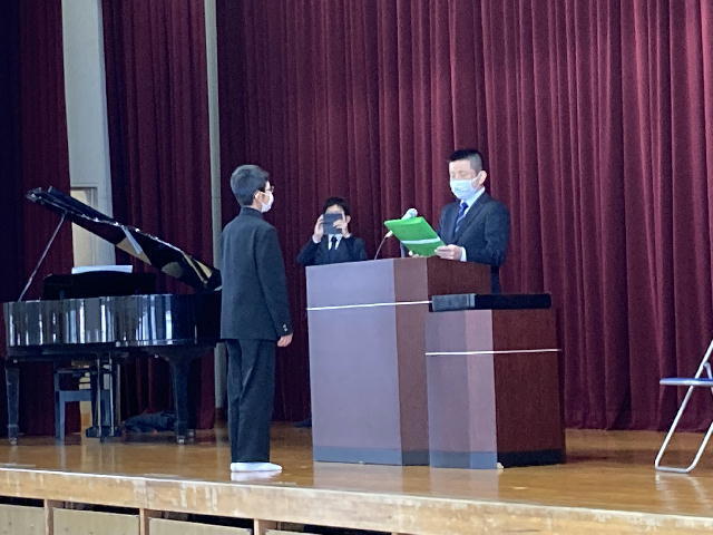 25日(金)1年の最後を締めくくる修了式が終わりました。1年代表 松浦圭汰くんが、入学してから中学校と小学校の違いを大きく感じたことを発表してくれました、2年代表 松田 倖さんは、3学期になるにつれて、クラスがお互いを思いやることのできるクラスに変化したこと、最後の中体連(陸上)への決意を述べてくれました。生徒会代表 藤原昴生くんは、生徒会長としての半年、タブレットを使った生徒会活動、生徒会長としての責任の重さについて発表してくれました。その後、修了証を1年代表 青野 輝くん、2年代表 井上公陽くんが校長先生から受け取りました。校長先生は、「向上心」「努力は人を裏切らない」こと。しかし、すぐ結果にはつながらないことを話され、1・2年の時より成長した自分をつくることを話されました。皆さんの新しい4月からの第1歩を期待しています。
