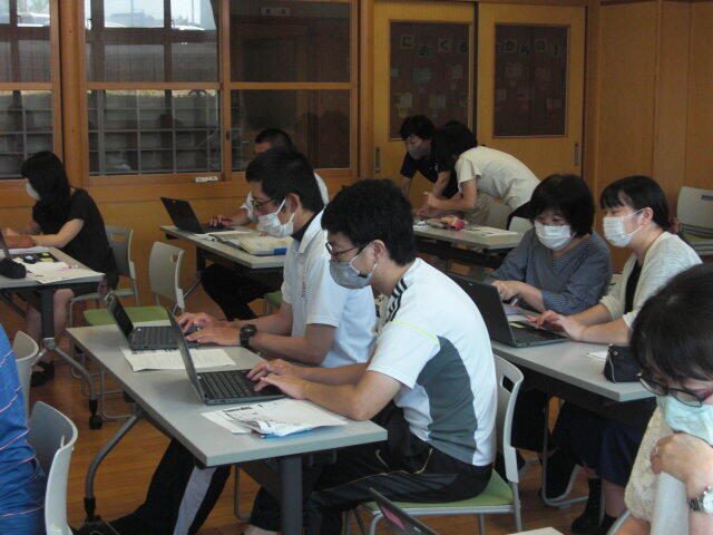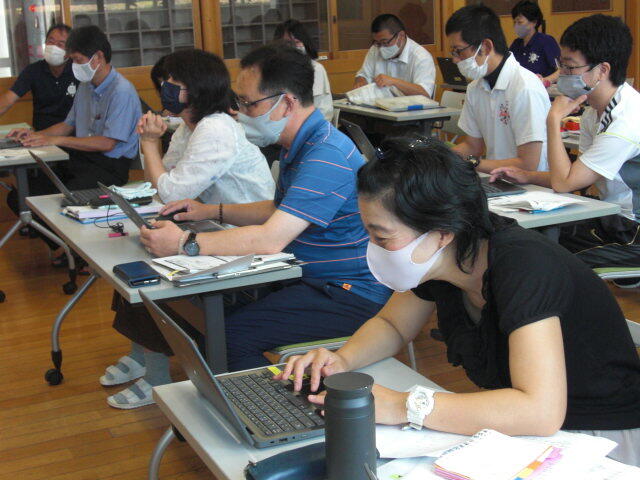 1学期に行った研究授業について、工夫したことや今後改善すべきことなどを話し合いました。今回は、7月5日に教育委員会の方から指導助言をいただいた内容を授業者が発表して全員で共有しました。後半は、タブレットを活用した授業例を発表し、職員同士で操作方法を学び合いました。