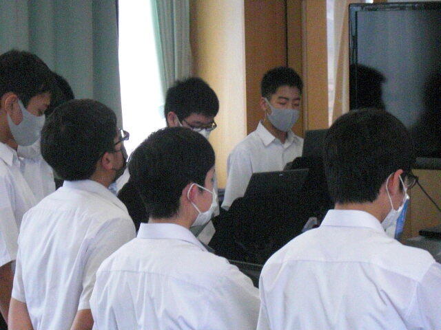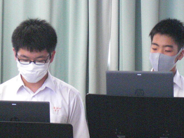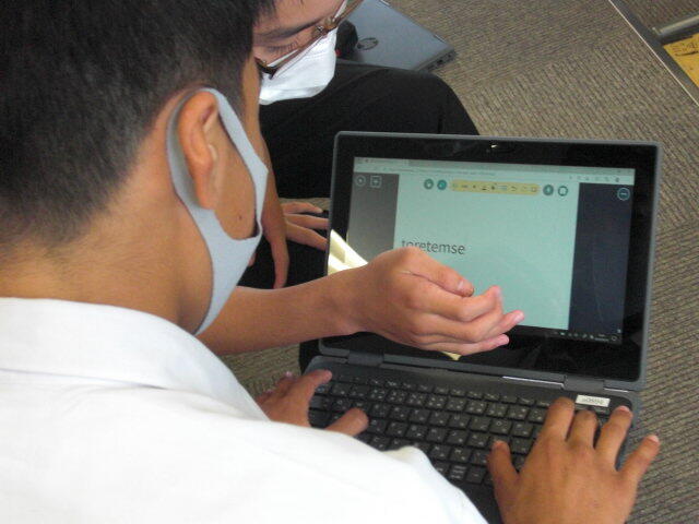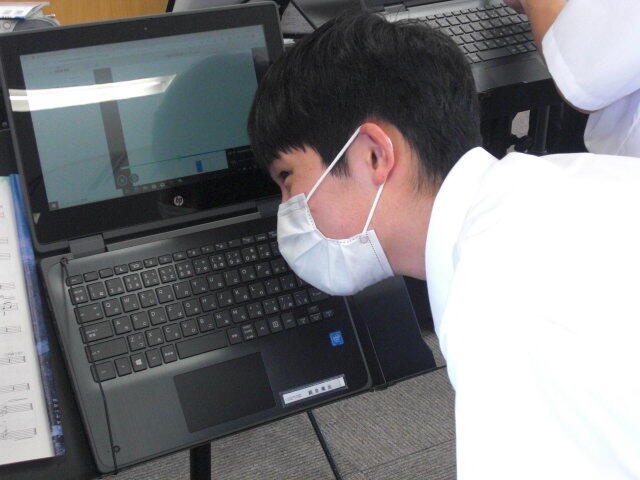 3年生の音楽で、「ふるさと」のパート練習をしています。タブレットのカメラを使って、自分が歌っている姿を見たり、録画・録音をしたりしています。マスクがいらない状態ならば、口の開け方を自分で確認・修正することもできます。録音した歌声は、自分で再生して聴くこともできます。また、指定したところに保存(提出)することで、他のパートの歌声を聴く(共有する)こともできます。
