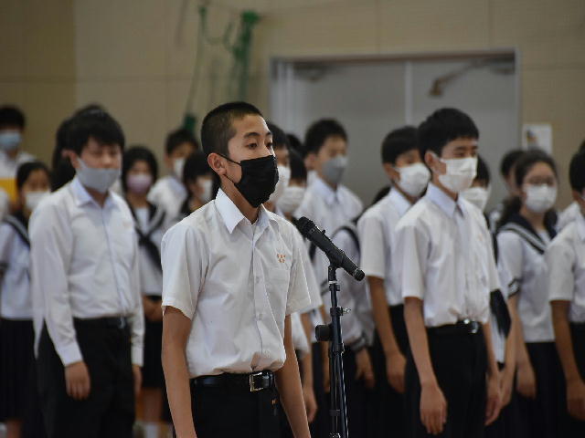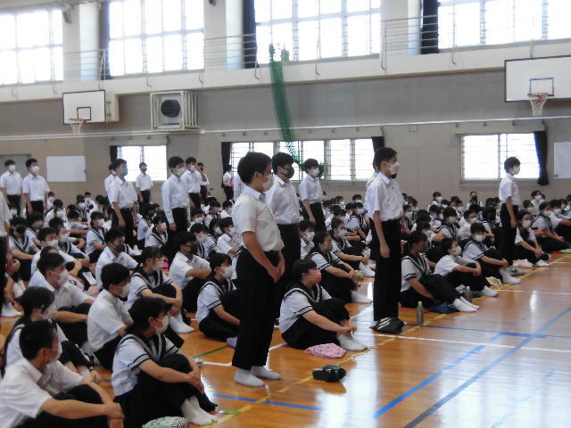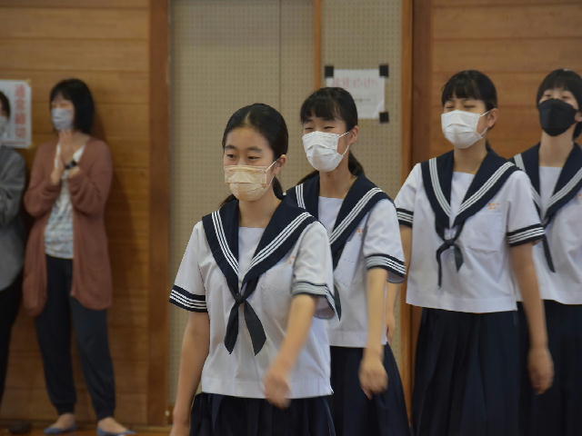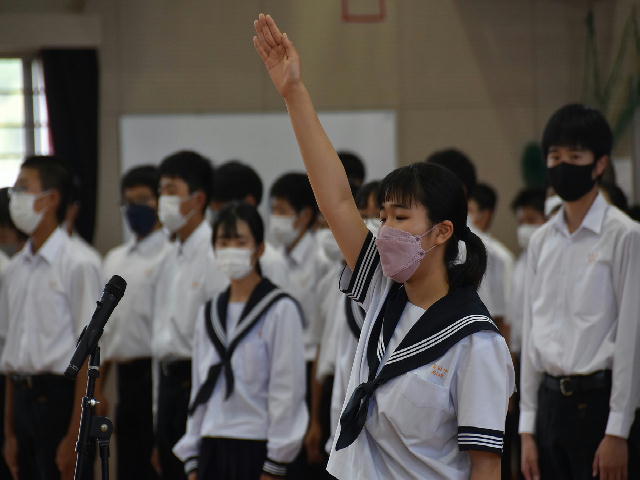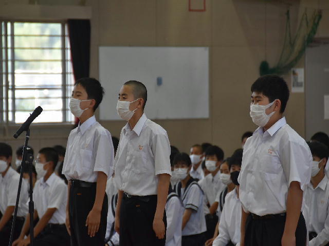 西都児湯地区中学校総合体育大会の選手推戴式を行いました。行進による選手入場から始まる本校ならではの推戴式は、3年生にとっても初めての経験となりました。