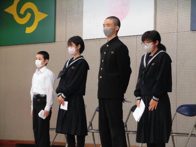 12月23日(金)に第2学期終業式を行いました。1学年代表 鶴田絆さん、2学年代表 長友羽奏さん、3学年代表 坂本裕さん、生徒会代表 黒木一花さんが、2学期の行事を振り返りながら発表しました。式後に各種表彰を行いました。また、学習面、生活面、健康面で、この冬休みに注意しておくこと、新年に向けて取り組んでおくことを確認しました。