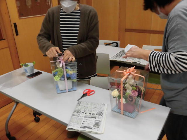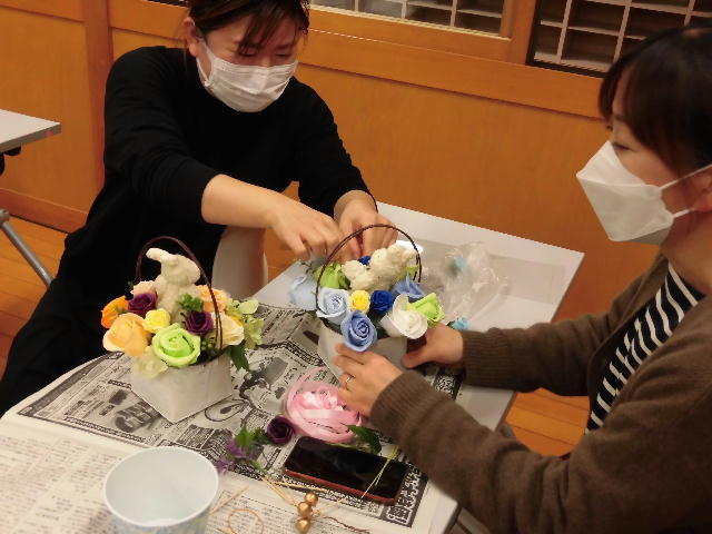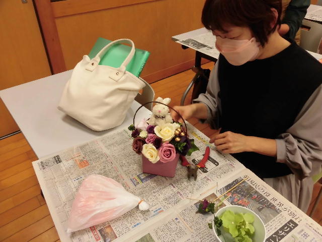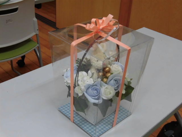 12月13日(火)PTA家庭教育学級フラワーアレンジメント講座(シャボンフラワー)が行われました。講師は高鍋町福岡生花店の福岡直樹さんです。シャボンフラワーというと、ピンとこない方もいらっしゃると思いますが、昔は石けんを原料とした花をつかってアレンジメントしたことからついた名前です。参加者それぞれ思い思いの作品をつくることができました。