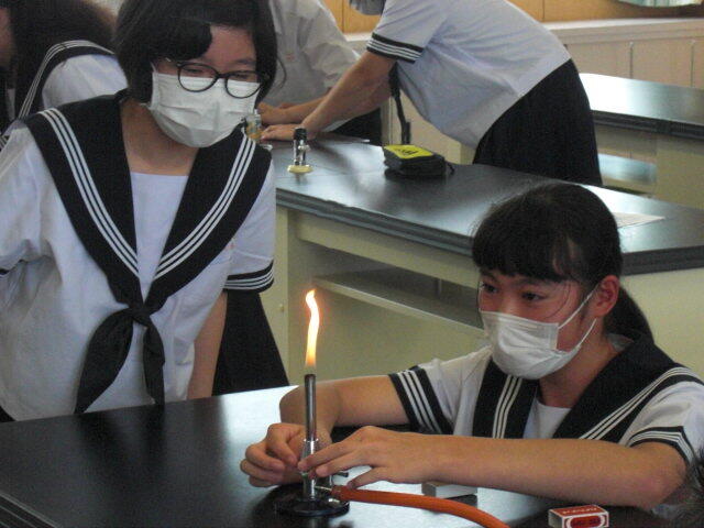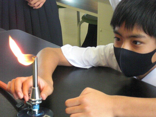 1年生の理科で、ガスバーナーの使い方を練習しました。全体的に上手にマッチの火をつけて、ガスバーナーの操作もスムーズにできました。昨日(7日・月)の午後の1組と2組の授業の様子と、今日の1校時に1組が次の実験に取り組んだ様子です。