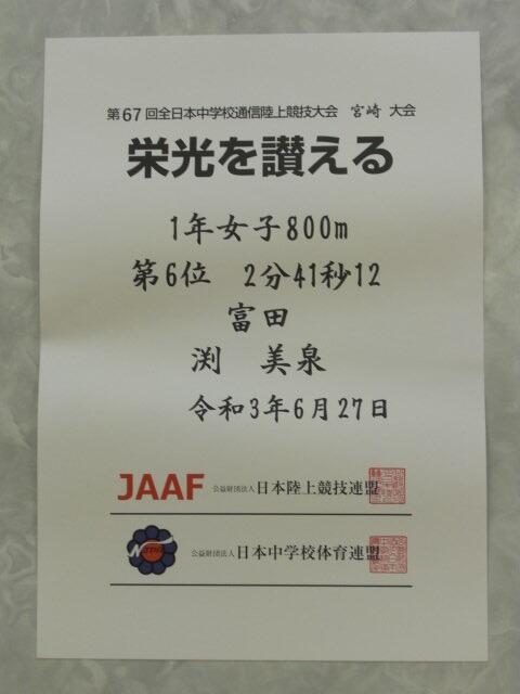 6月26日・27日に開催された「第67回全日本中学校通信陸上競技大会宮崎大会」において、次の3名が入賞しました。県大会での上位入賞というすばらしい成績です。