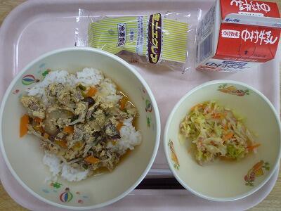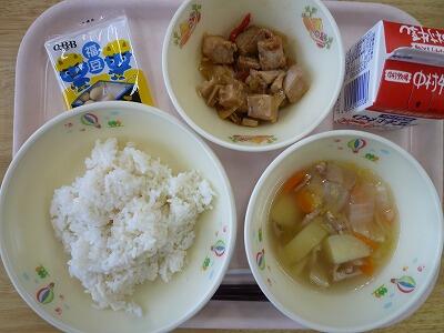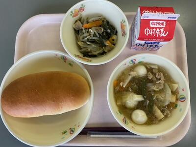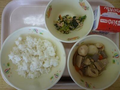 13日(木)のこんだては、「麦ご飯」「牛乳」「さんまのみぞれに、ゆでもやし添え」「のっぺい汁」です。