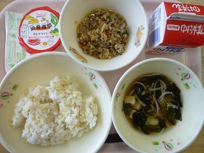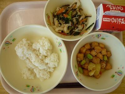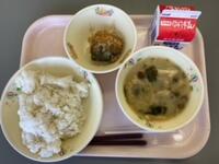 今日のこんだては、「麦ご飯」「牛乳」「鶏肉の味噌風味」「すまし汁」です。