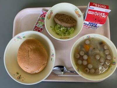 今日のこんだては、「バーガーパン」「牛乳」「バーガー用ハンバーグ・キャベツ・スライスチーズ」「白菜スープ」です。セルフバーガーの給食です。大きくてとても食べ応えがあります。汁物としての白菜スープは、白菜のうまみとコーン・ベーコンの甘みがとてもよく、温かいスープとともにお腹を満たしてくれます。