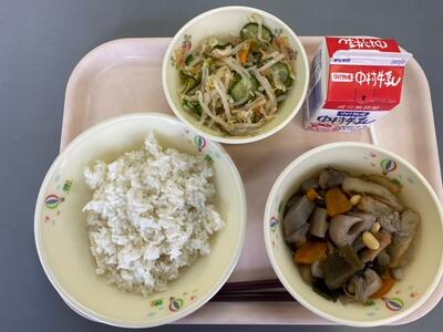 今日のこんだては、「麦ご飯」「牛乳」「きのこ豚丼の具」「サツマイモと大豆の揚げ煮」です。