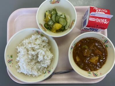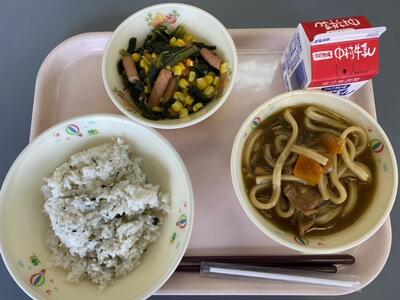 今日のこんだては、「減量うめなご飯」「牛乳」「カレーうどん」「もやしと小松菜のソテー」です。