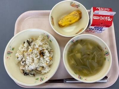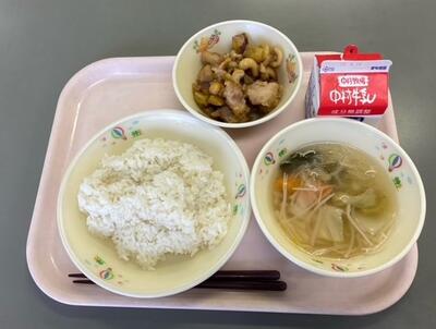 今日のこんだては、「栗ご飯」「牛乳」「つみれ団子汁」「秋なすと豚肉の味噌炒め」です。