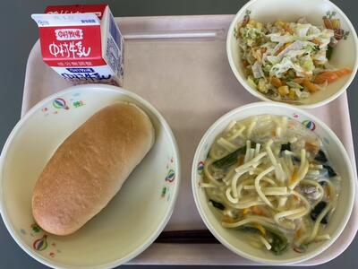 今日のこんだては「減量ミルクパン」「牛乳」「きのこスパゲッティー」「りっちゃんサラダ」です。