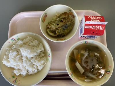 今日のこんだては、「麦ご飯」「牛乳」「ちくわの2色揚げ」「さといものすり流し汁」です。ちくわを、カレー・磯辺の2種類の味でフライしたものです。磯の香りと、カレーのスパイシーな香りが味わえます。汁物には里芋をすりおろして汁にしてあり、とろみがついて口の中にふわっと広がります。