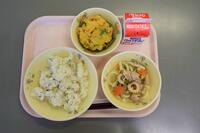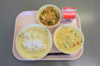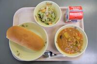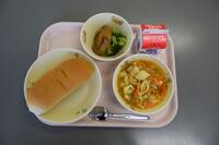 最近寒くなってきましたので、あったかいシチューはうれしいです。ケチャップとデミグラスで作られたシチューはほくほくなジャガイモやインゲン豆でさらにほっこりします。グリーンサラダがさっぱりとしてます。チーズパンでおなかもいっぱいになりました。(ちなみに12日は給食試食会でした)