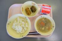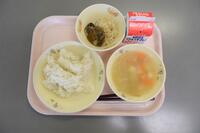 今日のこんだては、「麦ご飯」「牛乳」「ちくわの2色揚げ」「さといものすり流し汁」です。ちくわを、カレー・磯辺の2種類の味でフライしたものです。磯の香りと、カレーのスパイシーな香りが味わえます。汁物には里芋をすりおろして汁にしてあり、とろみがついて口の中にふわっと広がります。