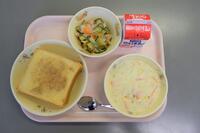 今日のこんだては、「セサミトースト」「牛乳」「米粉のクリームスープ」「ハムマリネ」です。