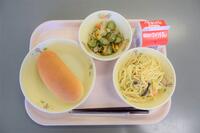 今日のこんだては「減量ミルクパン」「牛乳」「きのこスパゲッティー」「りっちゃんサラダ」です。