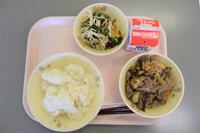 今日のこんだては、「麦ご飯」「牛乳」「牛肉の煮物」「いとかまぼこの酢の物」です。