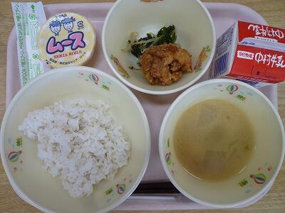 《麦ご飯 大根の味噌汁 鶏の唐揚げ ごま和え ムース 牛乳》