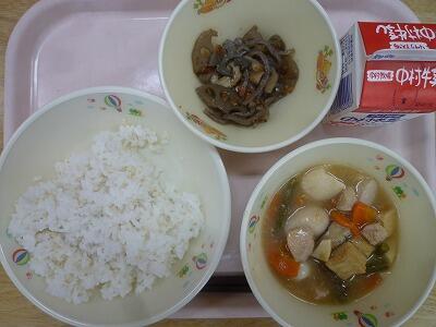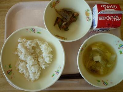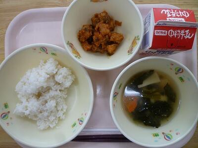 《麦ご飯 味噌汁 チキンチキンゴボウ 牛乳》