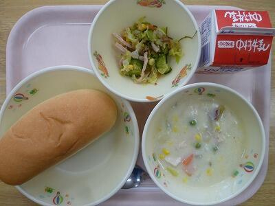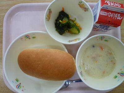 《チーズパン サーモンチャウダー 海藻サラダ 牛乳》