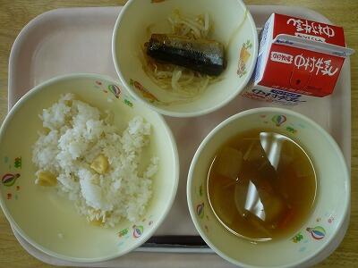 《栗ご飯 きのこ汁 サンマ甘露煮 ゆでもやし 牛乳》