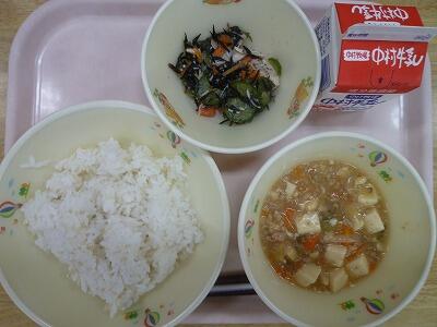 《麦ご飯 麻婆豆腐 ひじきと鶏ささみのサラダ 牛乳》