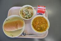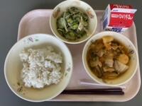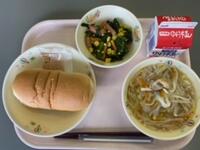 今日のこんだては。「コッペパン・リンゴジャム」「牛乳」「小松菜とウインナーのソテー」「鶏肉のフォー」です。