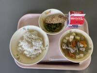 今日のこんだては、「麦ご飯」「牛乳」「チジャオロース」「中華風五目スープ」です。
