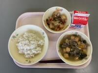 今日のこんだては。「麦ご飯」「牛乳」「大豆の五目煮」「キュウリとわかめの酢の物」です。