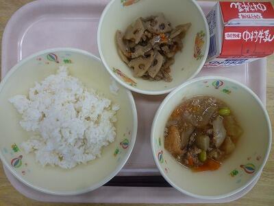 《麦ご飯 大根のそぼろ煮 きんぴらレンコン 牛乳》