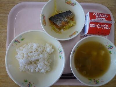 《麦ご飯 いももち汁 サワラの西京焼き おかか和え 牛乳》