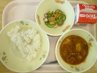 《麦ご飯 ハヤシライス たこのマリネ 牛乳》