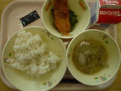 《麦ご飯 豚汁 シイラフライ インゲンのごま和え ソース 牛乳》