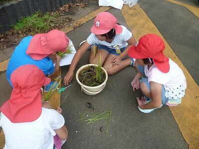 小学部5年生が学校で育てていたバケツ稲の餅米の収穫をしました。残念ながらあまりうまく実っていなかったのですが、お米をとって熱心に観察していました。これから新聞等にまとめる活動に入ります。