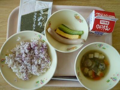 ≪ゆかりごはん ごぼうだんごじる 手巻きの具(ウィンナー・卵焼き・きゅうり)・のり・牛乳