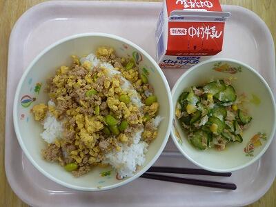 《麦ご飯 三色そぼろ丼の具 ツナサラダ 牛乳》