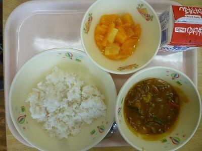 《麦ご飯 夏野菜カレー フルーツポンチ 牛乳》