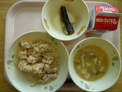 《キムタクご飯 味噌汁 鰯のおかか煮 牛乳》