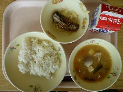 《麦ご飯 キムチ汁 鰯の梅煮 ゆでもやし 牛乳》