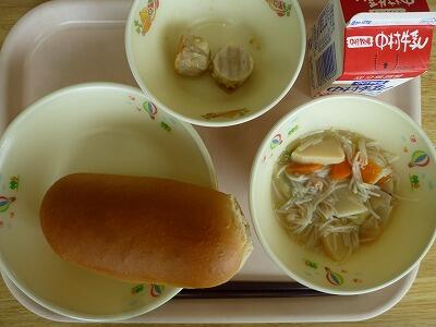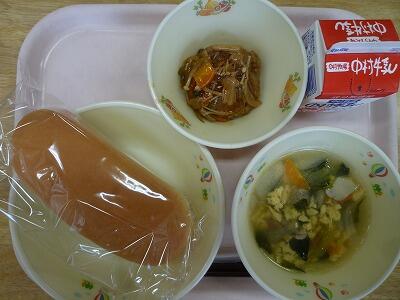 《コッペパン 卵スープ ハンバーグきのこソース 牛乳》