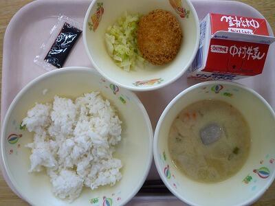 《麦ご飯 豆乳味噌汁 枝豆と豆腐のミンチカツ キャベツ ソース 牛乳》