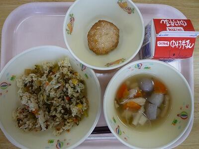 《高菜飯 のっぺい汁 玄米入りつくね 牛乳》