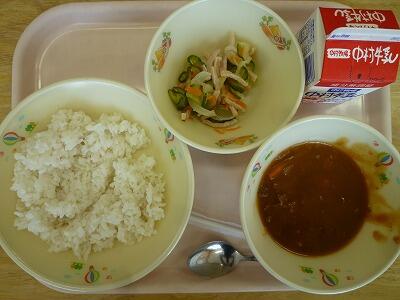 《麦ご飯 ハヤシライス ハムマリネ 牛乳》