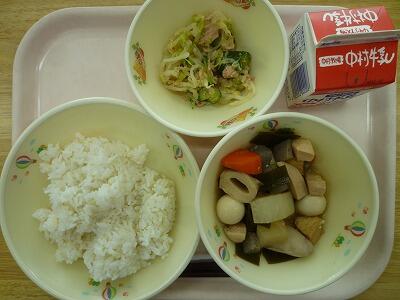 《麦ご飯 おでん煮 ごまず和え 牛乳》