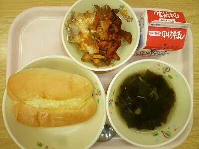 《マヨネーズパン わかめスープ 魚のピザソース焼き 牛乳》
