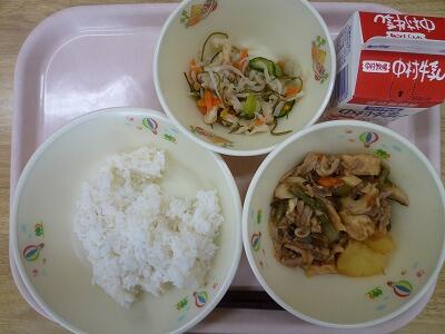 《麦ご飯 豚肉とジャガイモのふくめ煮 千切り大根の酢の物 牛乳》